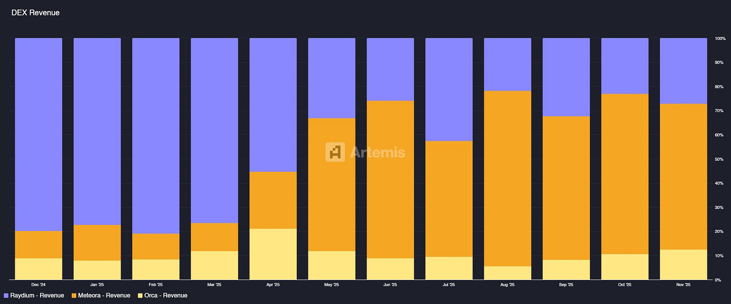 - ◆Meteora commands 60% revenue share among Solana’s top three DEXs, generating $4.2M in November 2025 versus Raydium’s $1.9M and Orca’s $868K. This revenue leadership reflects genuine operational superiority rather than temporary positioning, with Meteora capturing disproportionate value from the memecoin trading segment through superior capital efficiency and launchpad infrastructure (see Chart 3: Solana DEX Revenue Market Share).