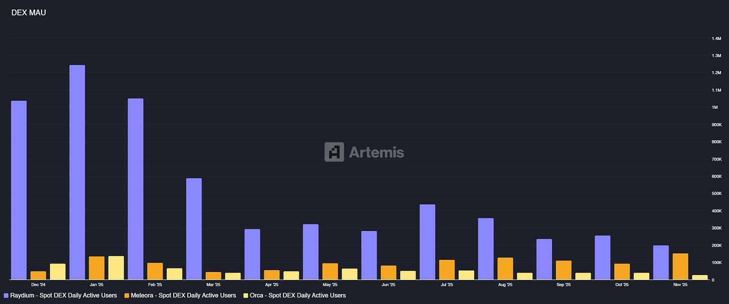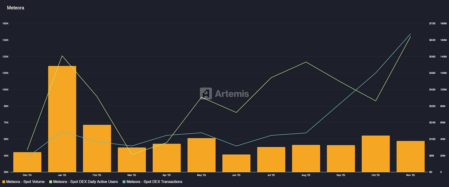 - ◆Meteora has demonstrated remarkable operational scaling over the past year, with trading volume surging 57% from $9.7B in December 2024 to $15.2B in November 2025. This consistent growth trajectory has positioned the protocol in close competition with Raydium for Solana’s second-largest DEX position by spot volume.