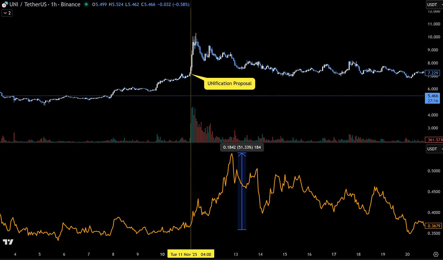- ◆Market behavior validates narrative-driven re-rating thesis: When Uniswap announced fee switch proposal, Meteora’s price rallied in sympathy (+50% in 2 days), demonstrating investors actively monitor DEX value accrual mechanisms and rotate capital accordingly. This price action confirms market participants recognize Meteora’s comparable positioning but are waiting for catalyst announcement and positive altcoin trading environment to establish the narrative before deploying significant capital. The correlation suggests substantial pent-up demand that releases once Meteora provides clear value accrual framework, similar to how UNI surged 40% on proposal announcement despite fee switch remaining months away from activation.