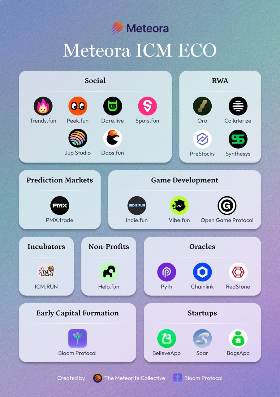 - ◆Meteora’s differentiation stems from monopolistic control over Solana’s institutional launchpad infrastructure. Since launching DBC in April 2025, 422K+ tokens have been created across 14 integrated launchpad partners spanning verticals competitors cannot access: Believe (early-stage founder funding), PMX.Trade (prediction markets), Time.fun (creator monetization competing with Twitch/Patreon), Collaterize (RWA tokenization), and Help.fun/Bags (charitable fundraising/developer recognition). This breadth positions Meteora not merely as memecoin launch venue but as infrastructure for Internet Capital Markets, enabling tokenization of emerging ideas, creators, and real-world assets beyond speculative trading.