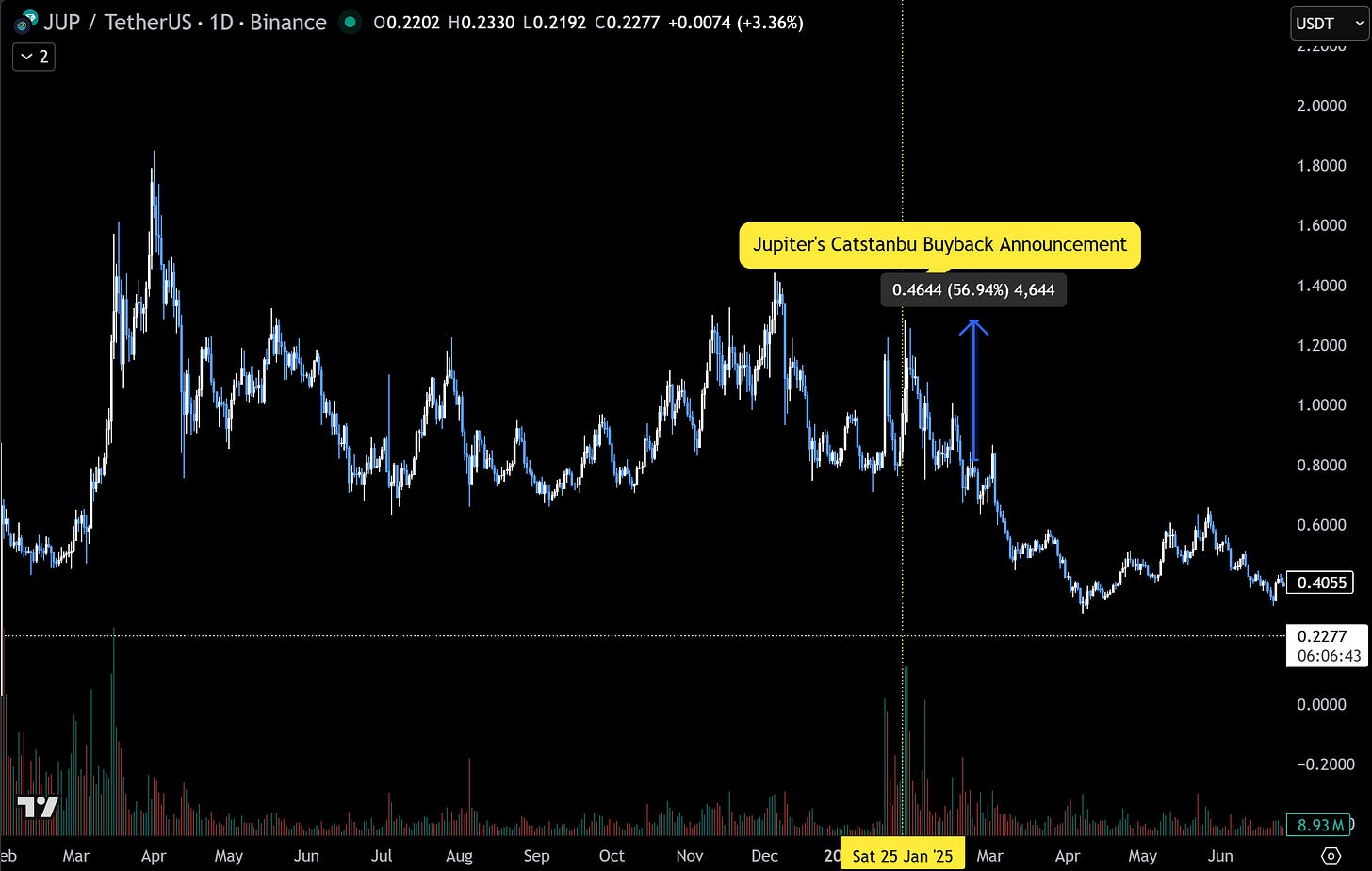 Conference-driven price catalysts in DeFi demonstrate predictable patterns when combining product substance with token economics, with Jupiter’s Catstanbul (January 25-26, 2025) establishing the benchmark for high-impact community events. Jupiter’s conference generated a 40% price rally from $0.90 to $1.27 through comprehensive announcements including 3B JUP token burn (30% of total supply), 50% fee buyback program, strategic acquisitions (Moonshot and SonarWatch), V2 platform redesign with Ultra Mode and Jupiter Shield, etc. The market response demonstrated sustained conviction rather than transient speculation, with price maintaining $1.05+ for weeks post-event while trading volume surged 3.6x to $1.48B and open interest reached all-time high of $363M. The key insight from Catstanbul’s success: protocols strategically cluster major announcements at conferences to maximize surprise and media amplification, creating information asymmetry that benefits investors positioned beforehand while the broader market remains unaware of pending reveals. This playbook generates concentrated volatility spikes as the market rapidly reprices on unexpected news, with those anticipating conference timing capturing outsized returns during the initial rally phase.
