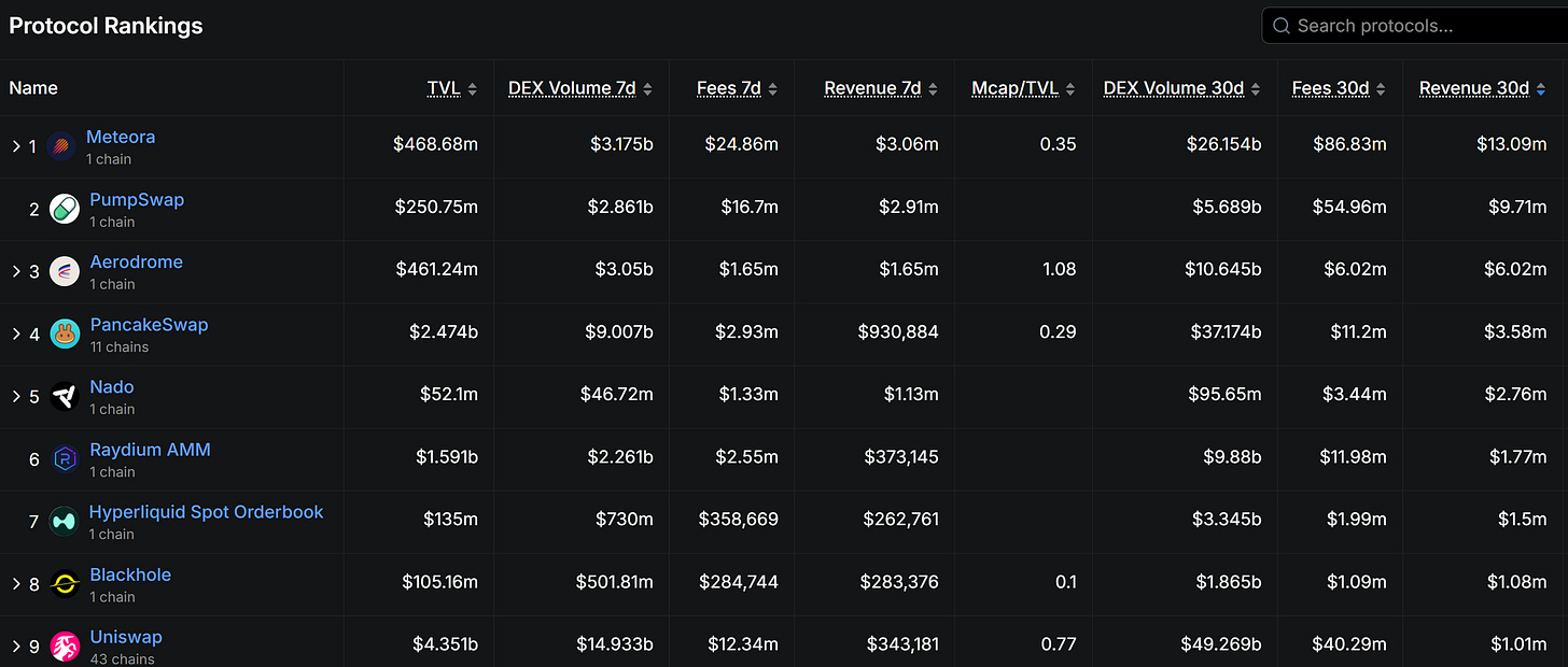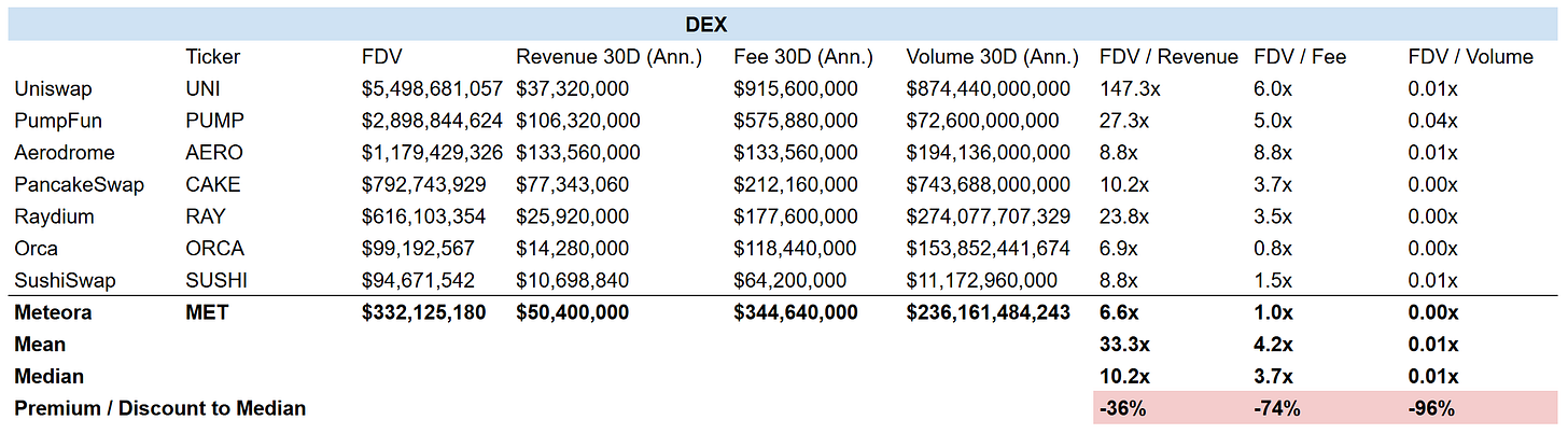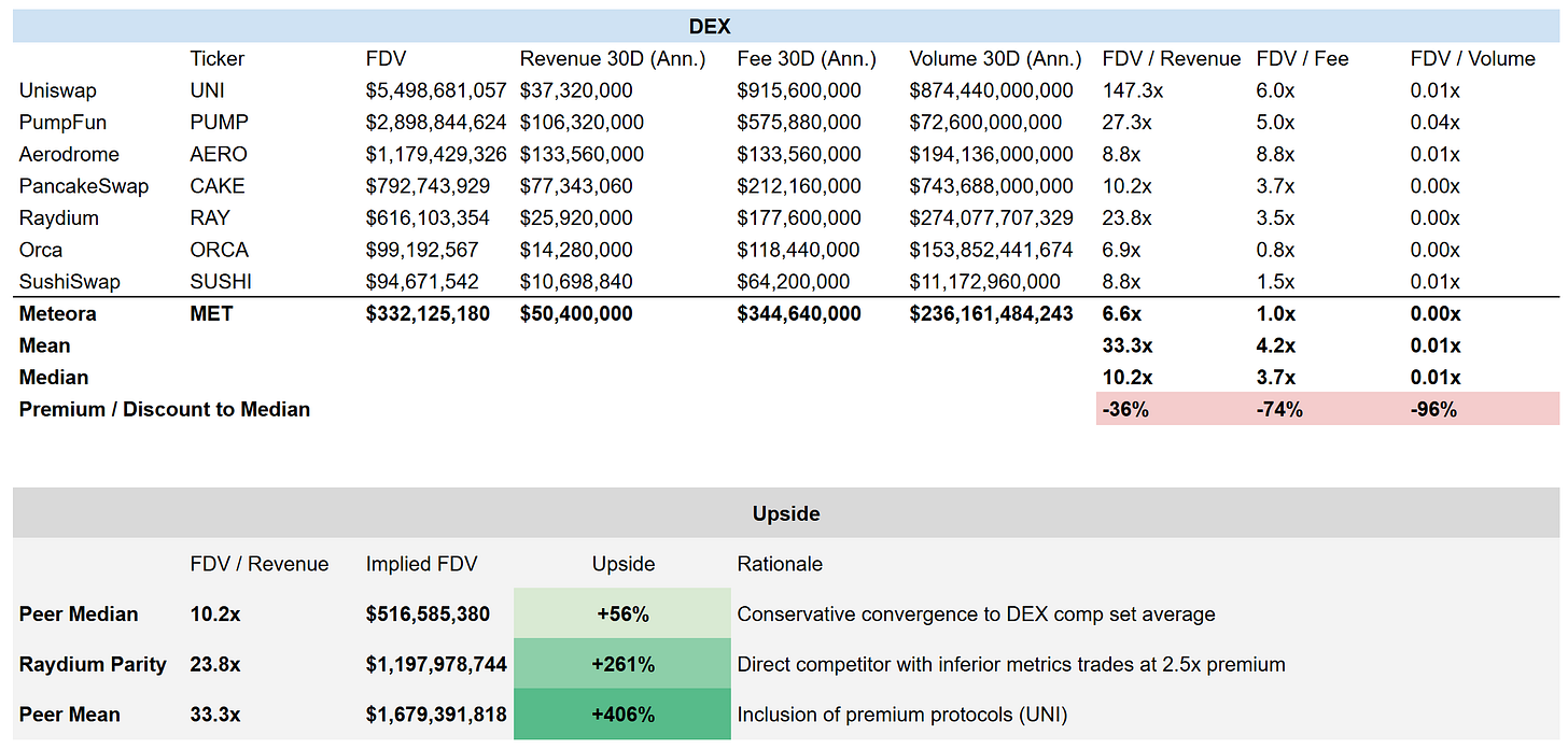 Meteora trades at a 6**.6x FDV/Revenue** multiple against a $332M FDV and $50M annualized revenue, representing a 61% discount to the 17.0x peer median across major DEX protocols. This mispricing exists despite Meteora’s superior operational positioning within Solana’s DEX ecosystem, demonstrable through higher absolute revenue generation than direct competitors, technological moats, and strategic control of high-margin memecoin/launchpad trading infrastructure.