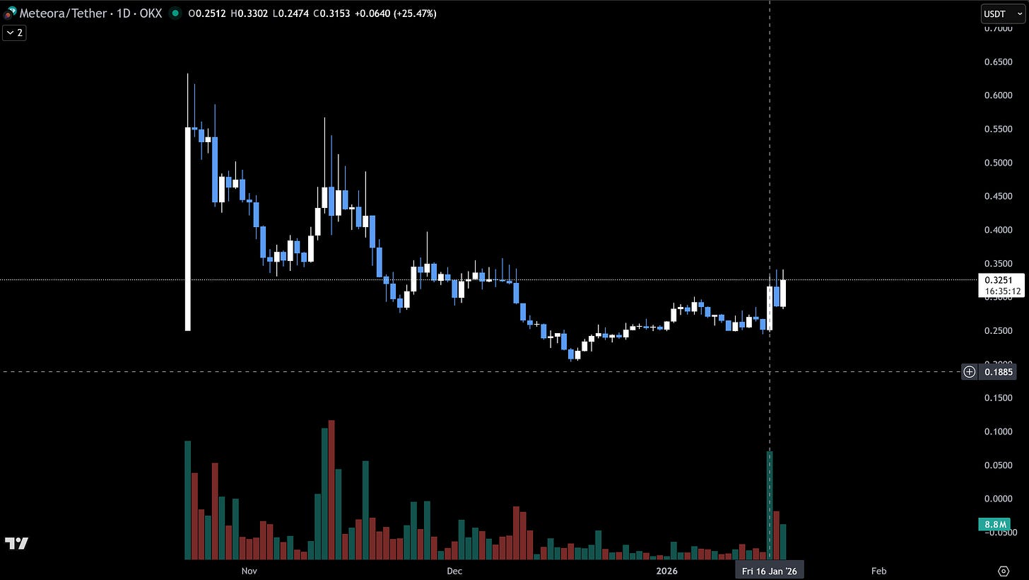 On the launchpad front, Bags.fm, built on Meteora’s Dynamic Bonding Curve (DBC) infrastructure, has emerged as a breakout catalyst for ecosystem attention. Activity on Bags.fm is spiking this week after the success of Gas Town’s token (GAS), with the platform ranking second on Jupiter’s launchpad leaderboard at approximately 15.4% market share. The creator-royalty model (1% perpetual fees to token creators) has attracted viral launches and mainstream exposure, including a livestream featuring MrBeast. This positions Meteora’s DBC infrastructure as the picks-and-shovels layer capturing fees across the Solana launchpad wars.MET is up 30%+, reflecting market participants connecting the dots between Bags.fm’s surge and Meteora’s underlying fee capture as the liquidity layer powering the platform.