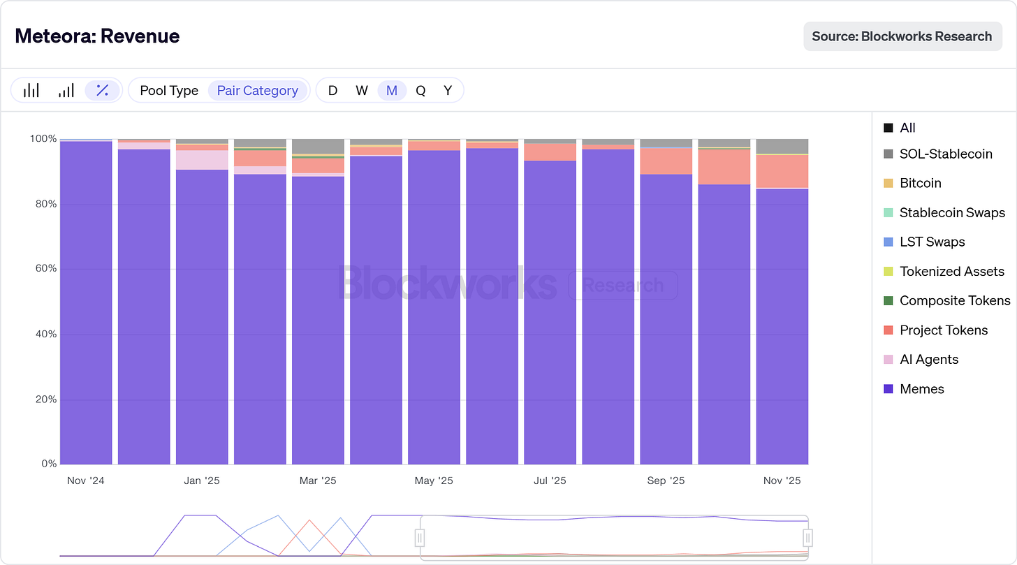 - ◆Notably, over 85% of protocol revenue derives from memecoin pools which command premium fee tiers due to higher volatility and trading frequency. This concentration, while appearing to present concentration risk, actually represents strategic positioning in Solana’s highest-margin market segment. At current run-rates, Meteora generates $75-115M in annualized revenue, placing it among the top revenue-generating DeFi protocols across all chains on a per-dollar-of-TVL basis.