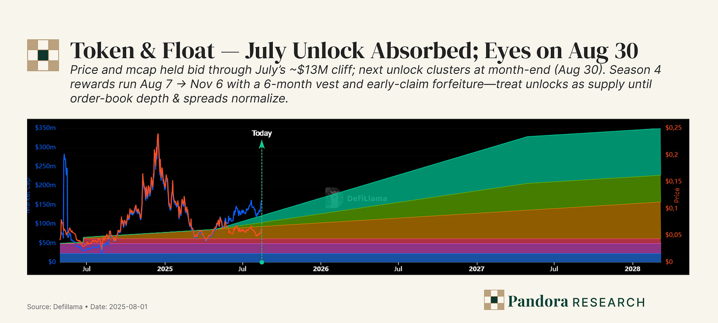 - ◆Float context: July’s ~$13M unlock was absorbed with price steady near $0.06; another month-end unlock is coming. Vesting slows reward supply. We treat unlocks as a monitoring item, not the core thesis.
