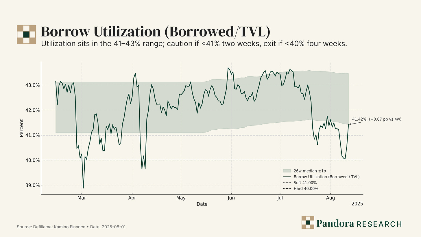 Utilization = Borrowed ÷ TVL in K-Lend. This filters idle deposits. Our full-series analysis shows a 41–43% typical band; using that history, we set data-grounded floors: caution <41% for two weeks; exit if <40% for four (outside chain-wide shocks). If listings and distribution are converting, utilization won’t live below those bands.