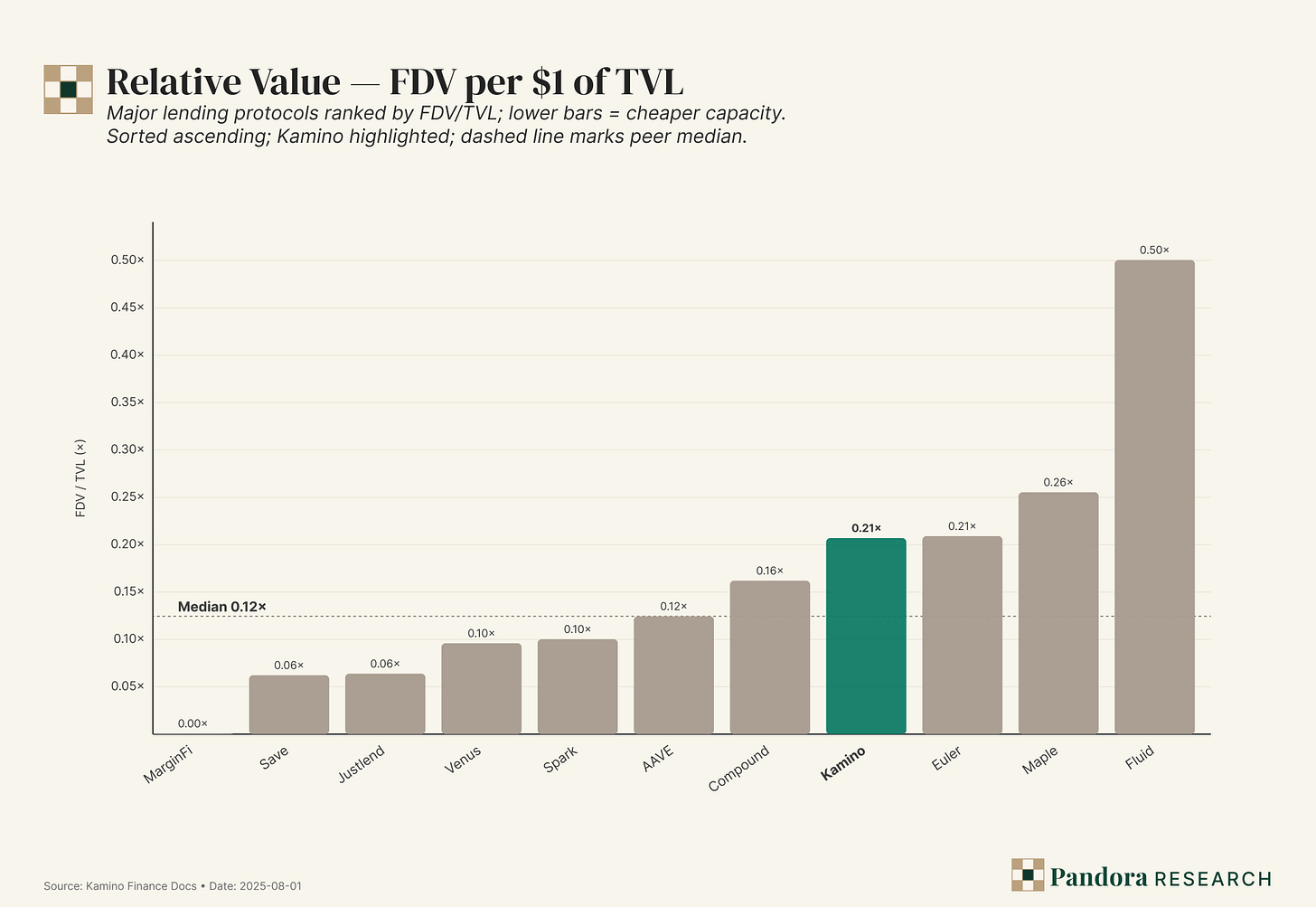 Why isn’t FDV/TVL enough? Because capacity (TVL) without throughput (fees/revenue) can look cheap while being unproductive. Kamino’s FDV/TVL ~0.21× is mid-pack; its P/S ~8× is cheap versus peers that monetize less per dollar of TVL yet trade at higher P/S.