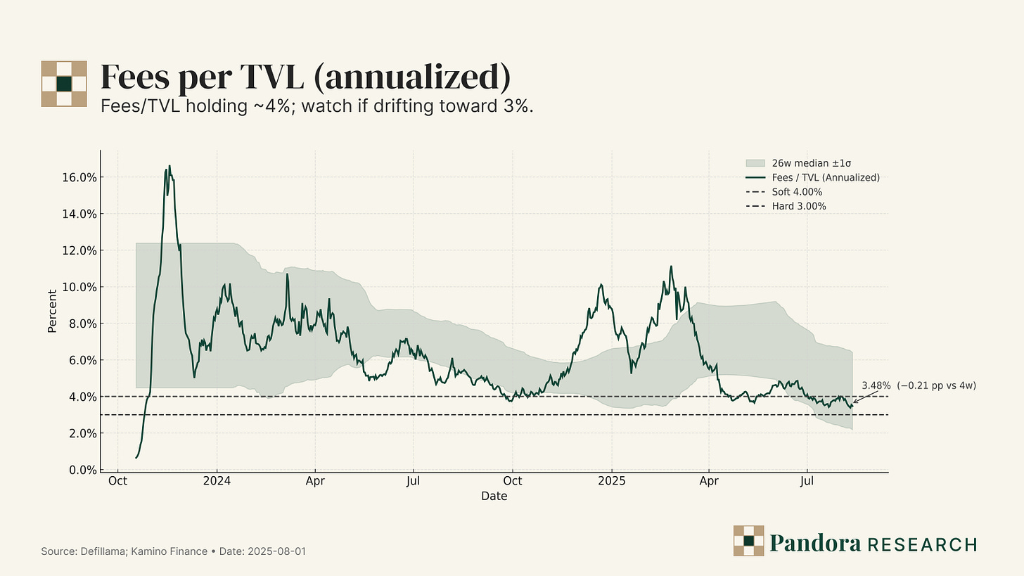 Interpretation. Kamino’s mix (61% util, 15.8% take) signals quality demand rather than subsidy-driven throughput. It is not extracting outsized fees to hit the 4% fees/TVL line; instead, it combines above-median utilization with a middle-of-pack take. That’s the combination you want to scale: credit that clears at normal pricing.