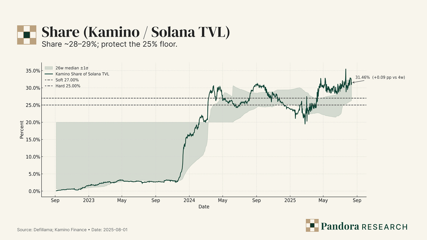 Share = Kamino TVL ÷ Solana DeFi TVL. Chain beta lifts (or caps) absolute volumes; falling share means the router premise is weakening regardless of local optimizations. Small moves matter: +200–300 bps share, held, compounds throughput even if fees/TVL is flat.