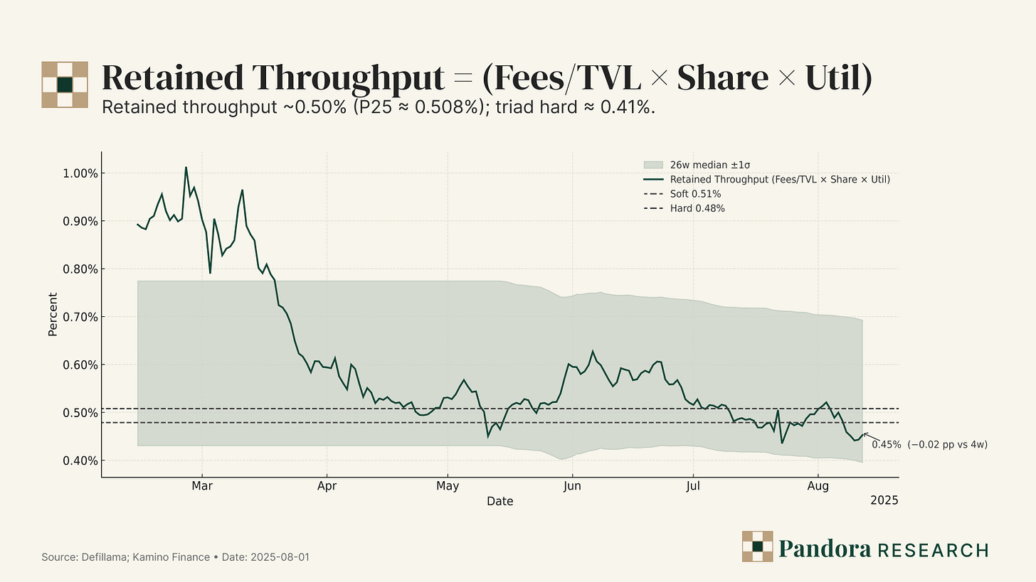 Retained Throughput ≈ (Fees ÷ TVL) × Share of Solana TVL × Borrow Utilization