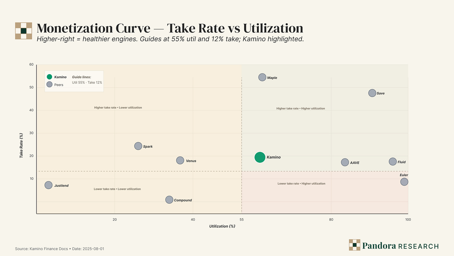 - ◆Healthy engine mix:Utilization ~61% with a 15.8% take rate puts Kamino in the upper-right of both monetization plots—credit is actually deployed and monetized without requiring outsized fee splits.