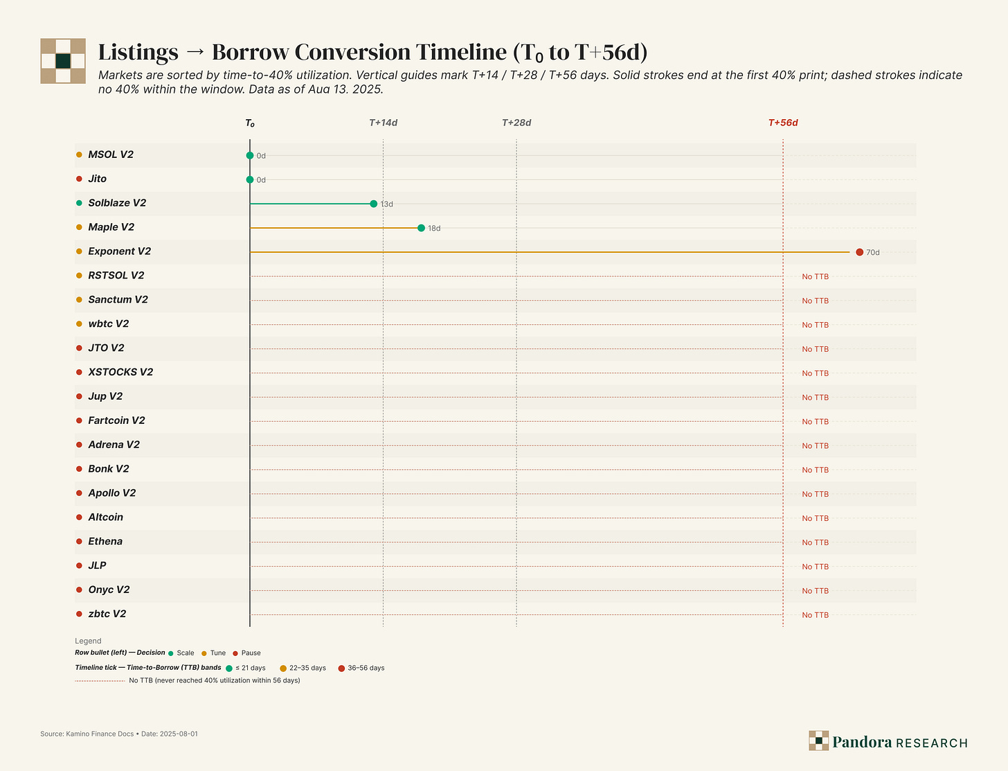 This discipline operationalizes the flywheel. Listings that convert inside eight weeks and retain ≥60% of early borrow lift fees/TVL and borrowed/TVL without subsidy—exactly what the market should pay a multiple for. Conversely, lanes that can’t hit 40% by T+56d or keep borrow post-campaign are rented TVL. The kill-switches here (Scale / Tune / Pause) keep the router focused on throughput that sticks, which is what ultimately defends the long in KMNO.
