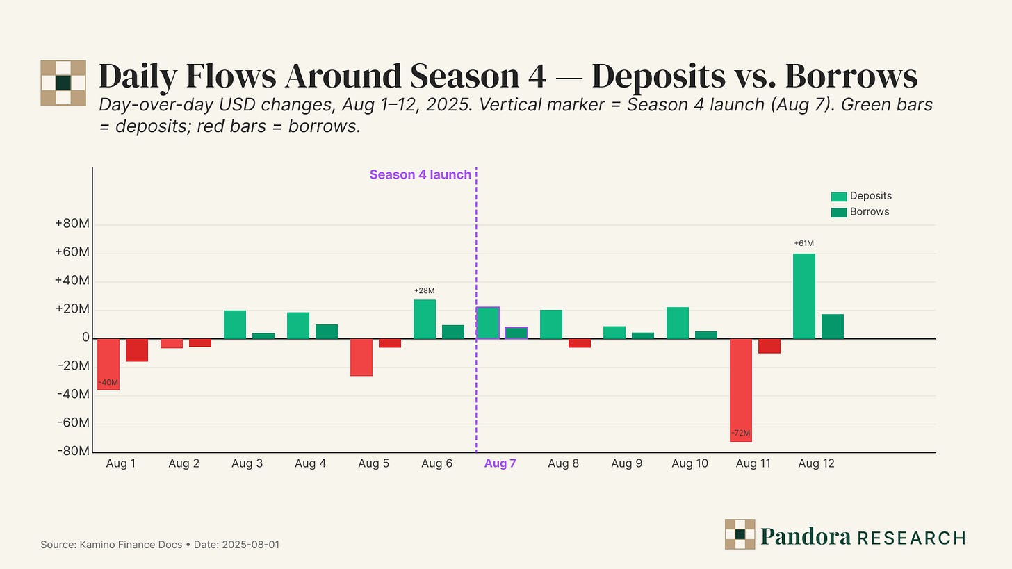 - ◆Season 4 read: flows have been deposit-led with a short lag in borrows—fine if conversion/retention follows. The right success test is 7/14/30-day retention and whether deposit surges are matched by borrow days, not headline TVL.