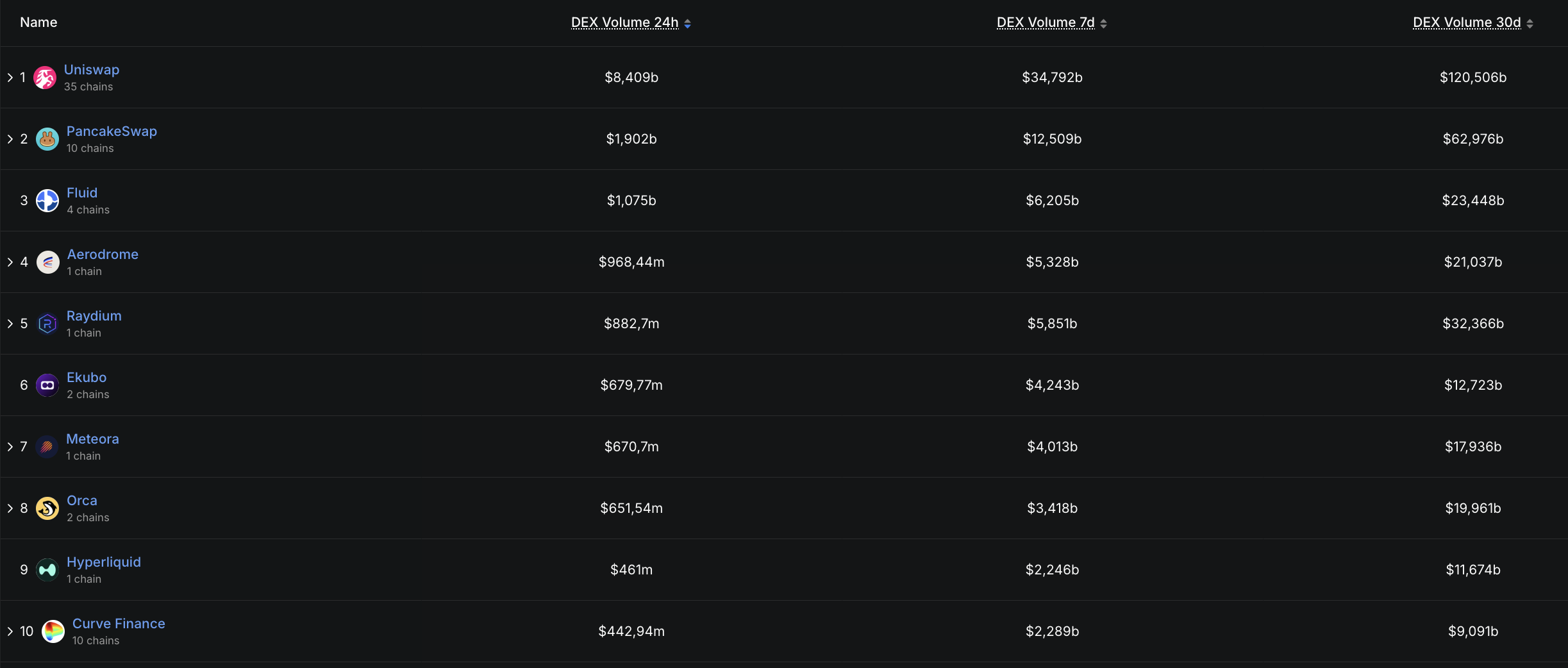 Uniswap (and its clone PancakeSwap) still controls the lion’s share of EVM volume and TVL, 65-70% on most days. New names appear (like Fluid), but none has dented Uniswap’s network effects yet. When one project drives most AMM upgrades and optimizations, progress moves at the pace of a single roadmap. There’s a clear lack of innovation coming from projects outside of Uniswap.