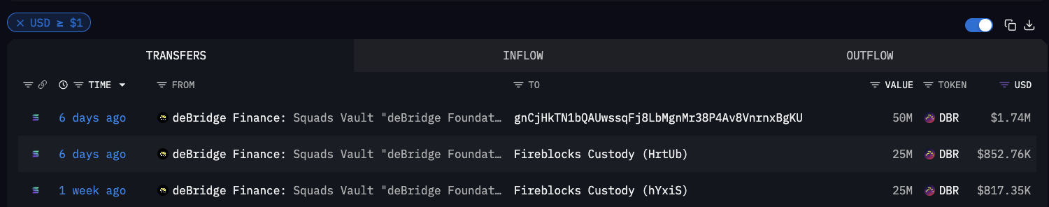 Quick post as I noticed some strange $DBR movements from the DBR Foundation main wallet. Last week they sent a total of 100M $DBR (1% of T. Supply) to three different wallets (screenshot #1 below):